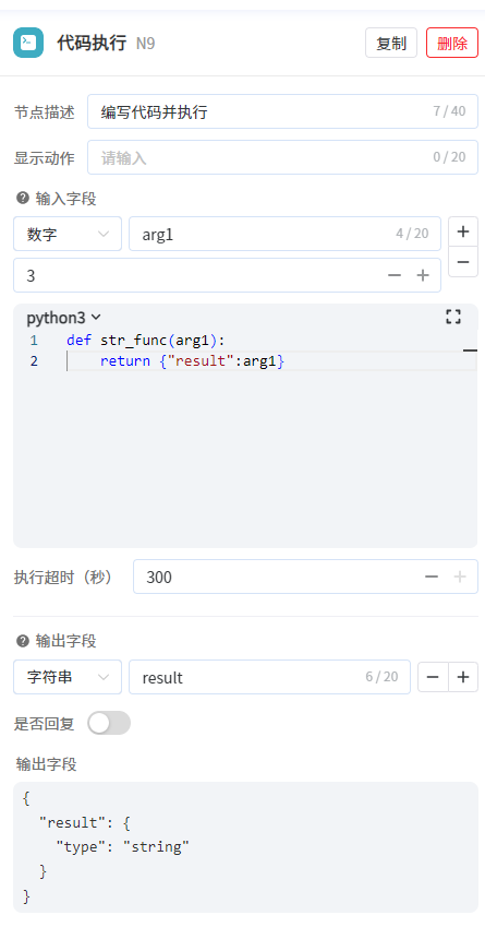 输出字段名称需要与代码中返回参数字段对应。代码执行后会将数据填入对应名称的参数中,实现数据传递,最终节点输出结果以输出字段为准。执行超时(秒)