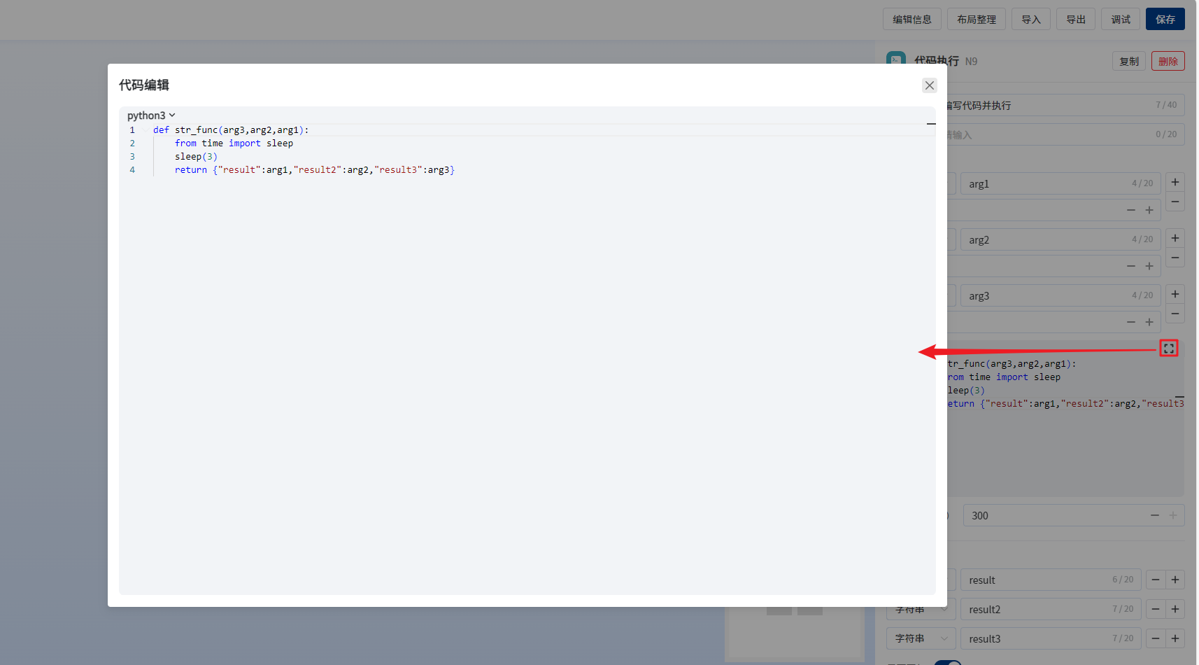输入字段名称与代码中函数入参对应,可以自定义增减和改名。代码执行时会将输入字段传入对应的参数中,所有参数名都必须在输入字段名中存在。输出字段