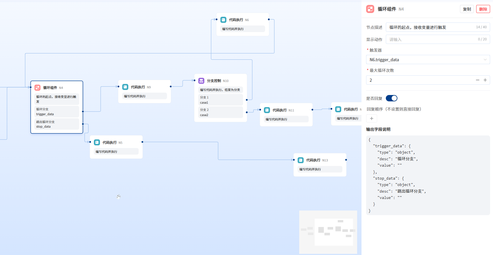 输出字段stop_data:存储跳出循环后,执行后续节点需要依赖的字段信息