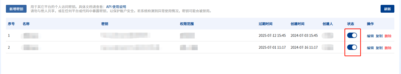 点击状态列可切换密钥状态(停用/启用)。