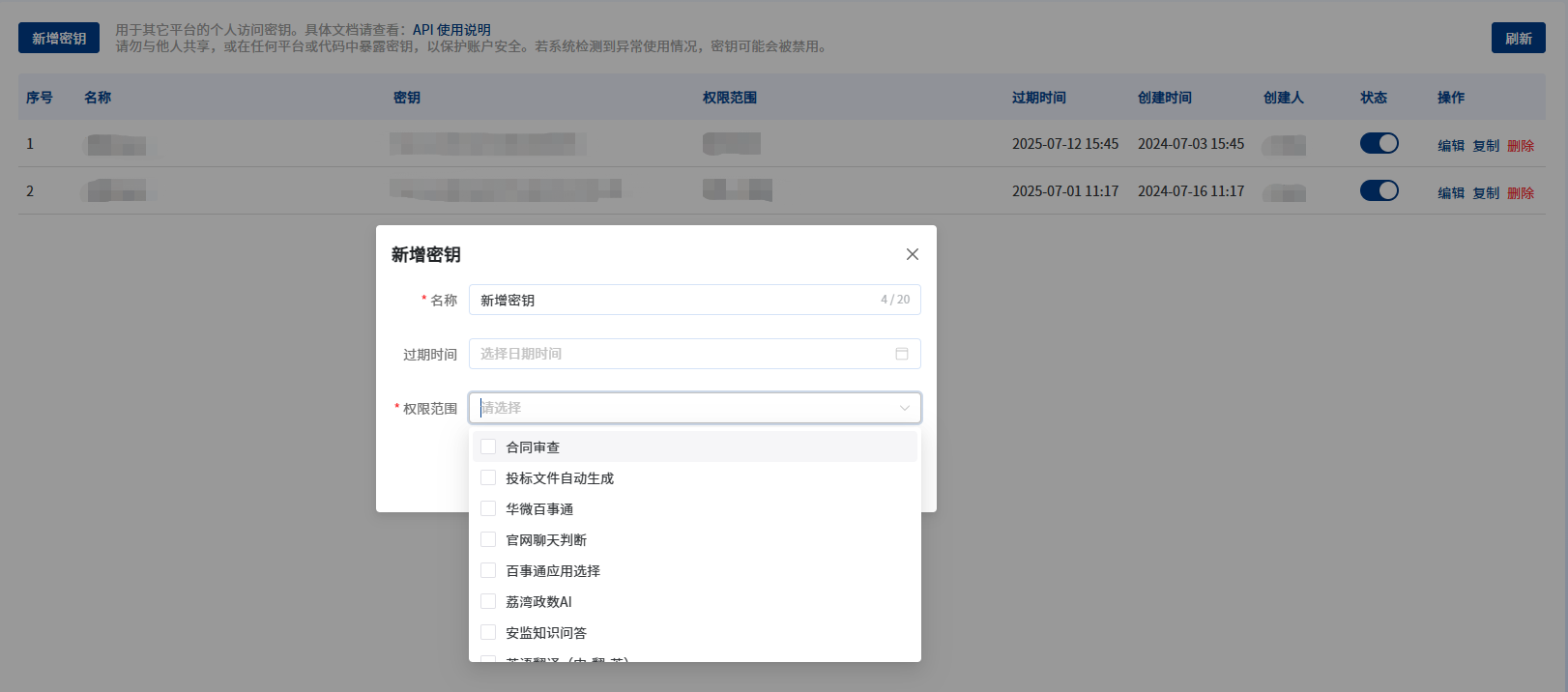 点击【新增密钥】,填写名称、过期时间(不选则永久)、权限范围(可选择5个(含)以下的应用)并保存。