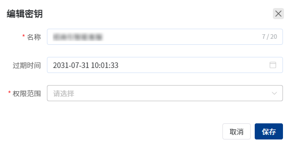 点击【编辑】,可修改密钥名称、过期时间和权限范围。